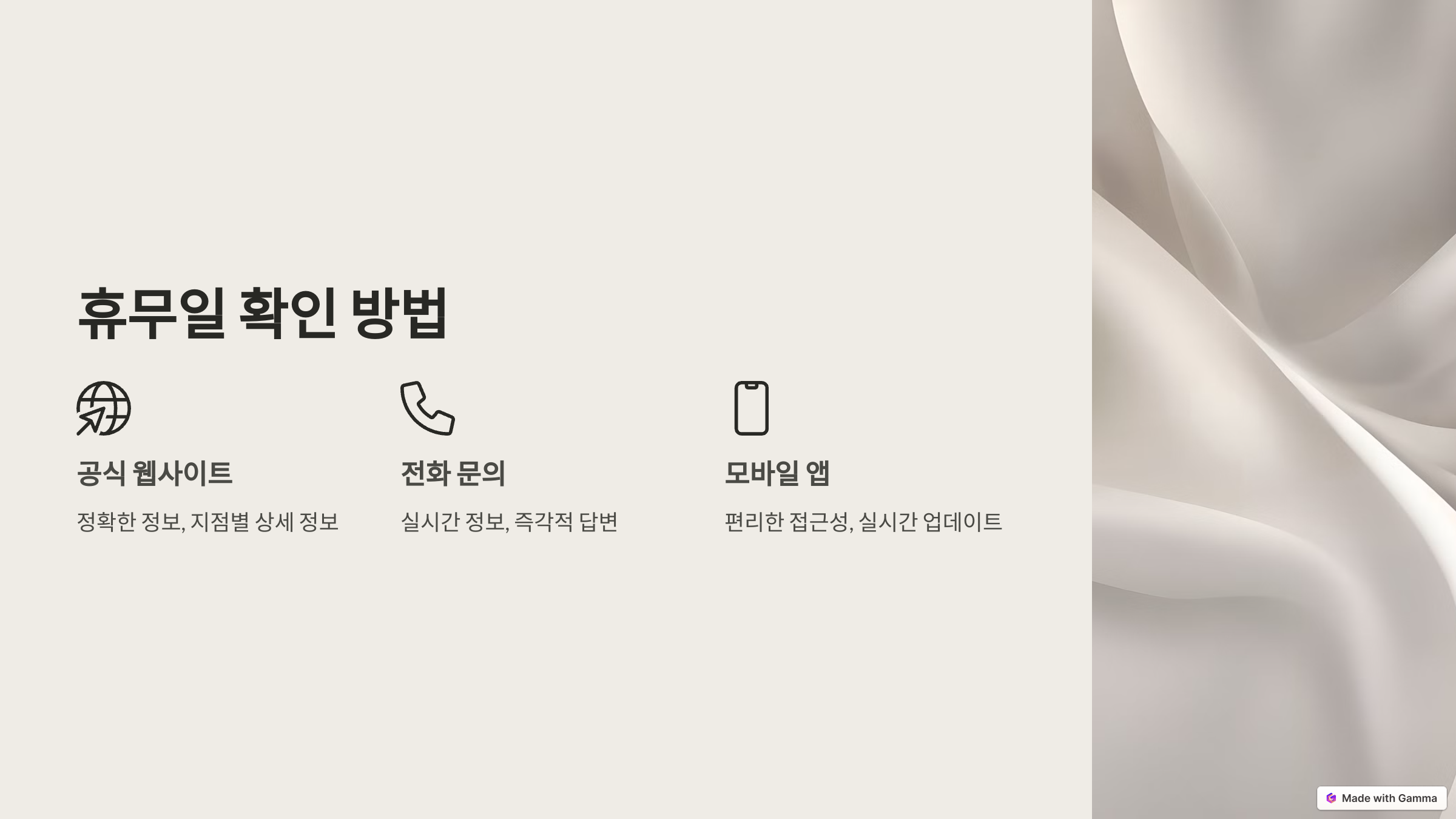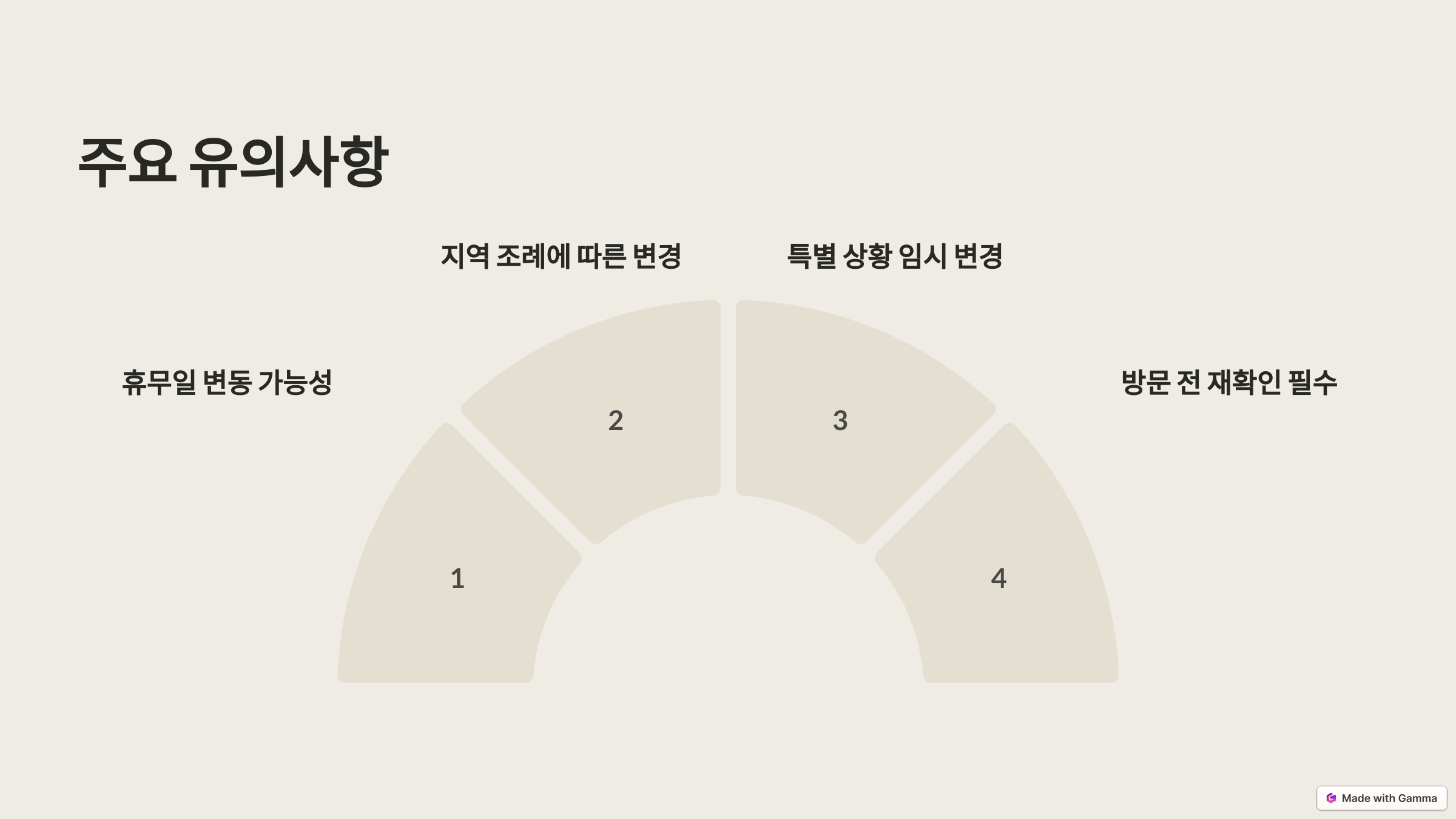 - 명절 연휴 기간 특별 운영 사전 확인 필수: - 방문 전날 재확인 권장 - 특별 행사 기간 확인 - 지역별 차이점 숙지
