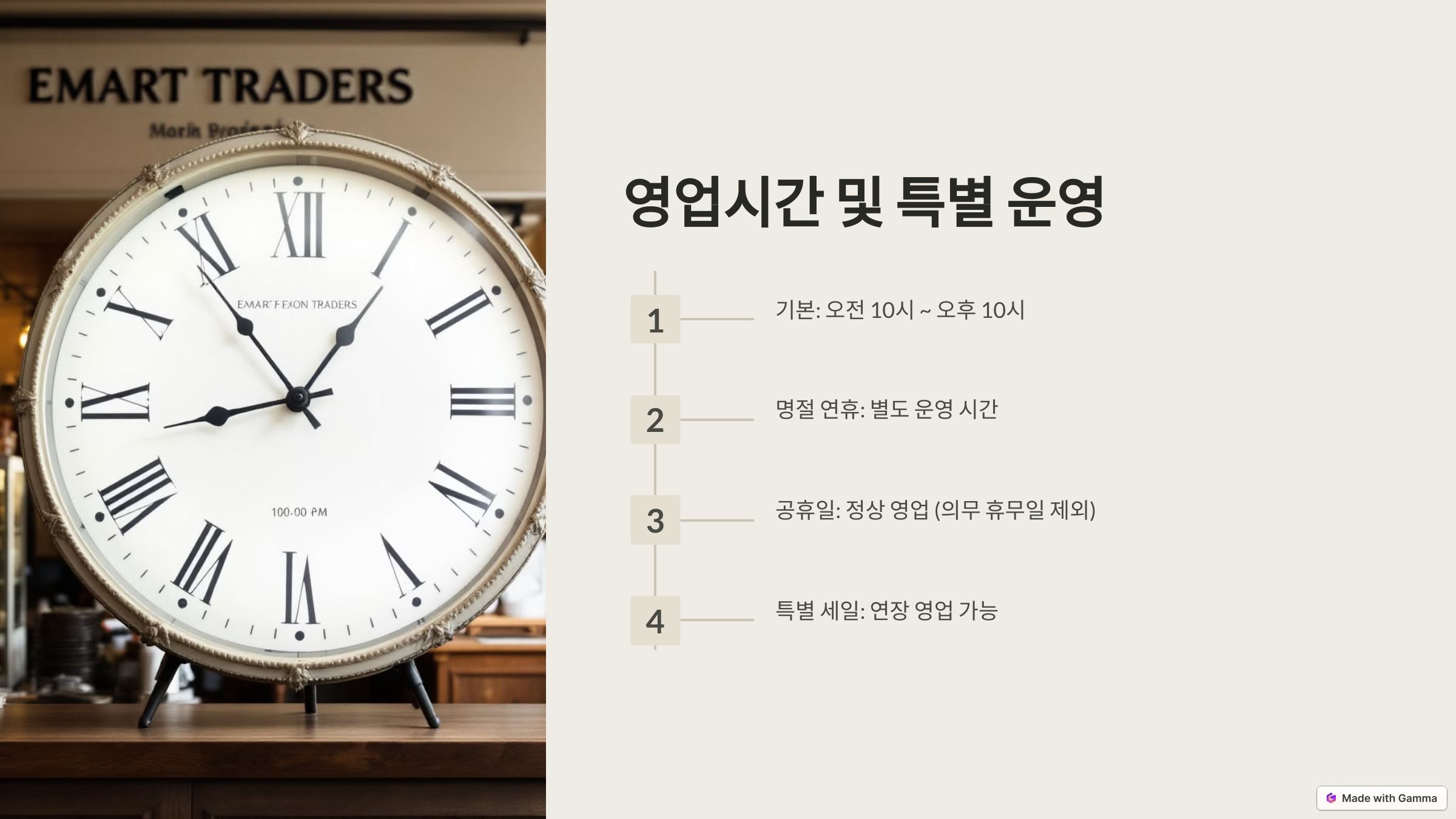 오전 10시 ~ 오후 10시 - 명절 연휴 기간: 별도 운영 시간 적용 - 공휴일: 정상 영업 (의무 휴무일 제외) - 특별 세일 기간: 연장 영업 가능성 있음