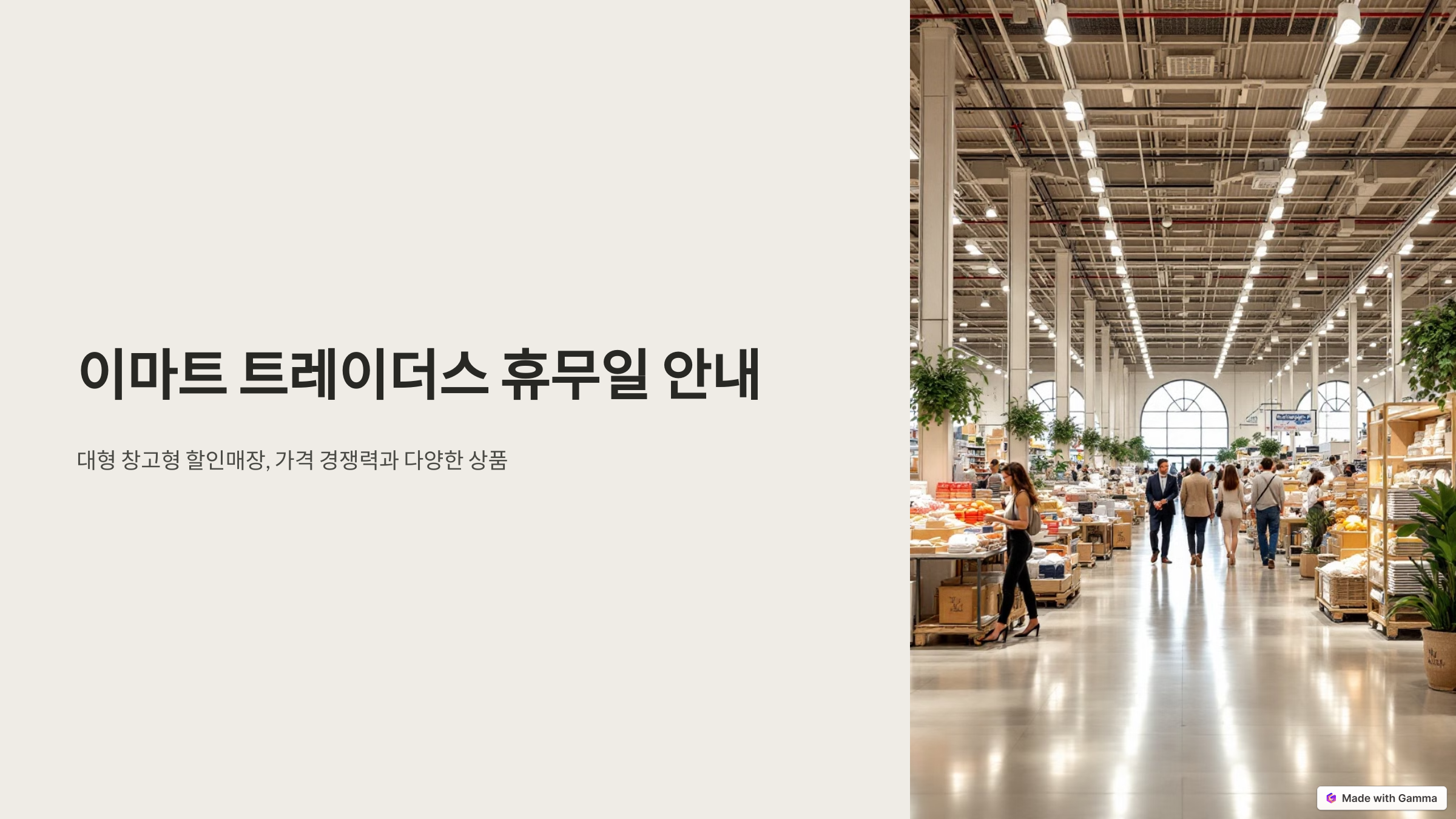 이마트 트레이더스 휴무일 제도 종합 안내 이마트 트레이더스는 신세계 그룹이 운영하는 대형 창고형 할인매장으로, 대량 구매를 통한 가격 경쟁력과 다양한 상품으로 소비자들에게 큰 인기를 얻고 있습니다. 효율적인 쇼핑을 위해 휴무일 제도와 운영에 대해 상세히 알아보겠습니다.