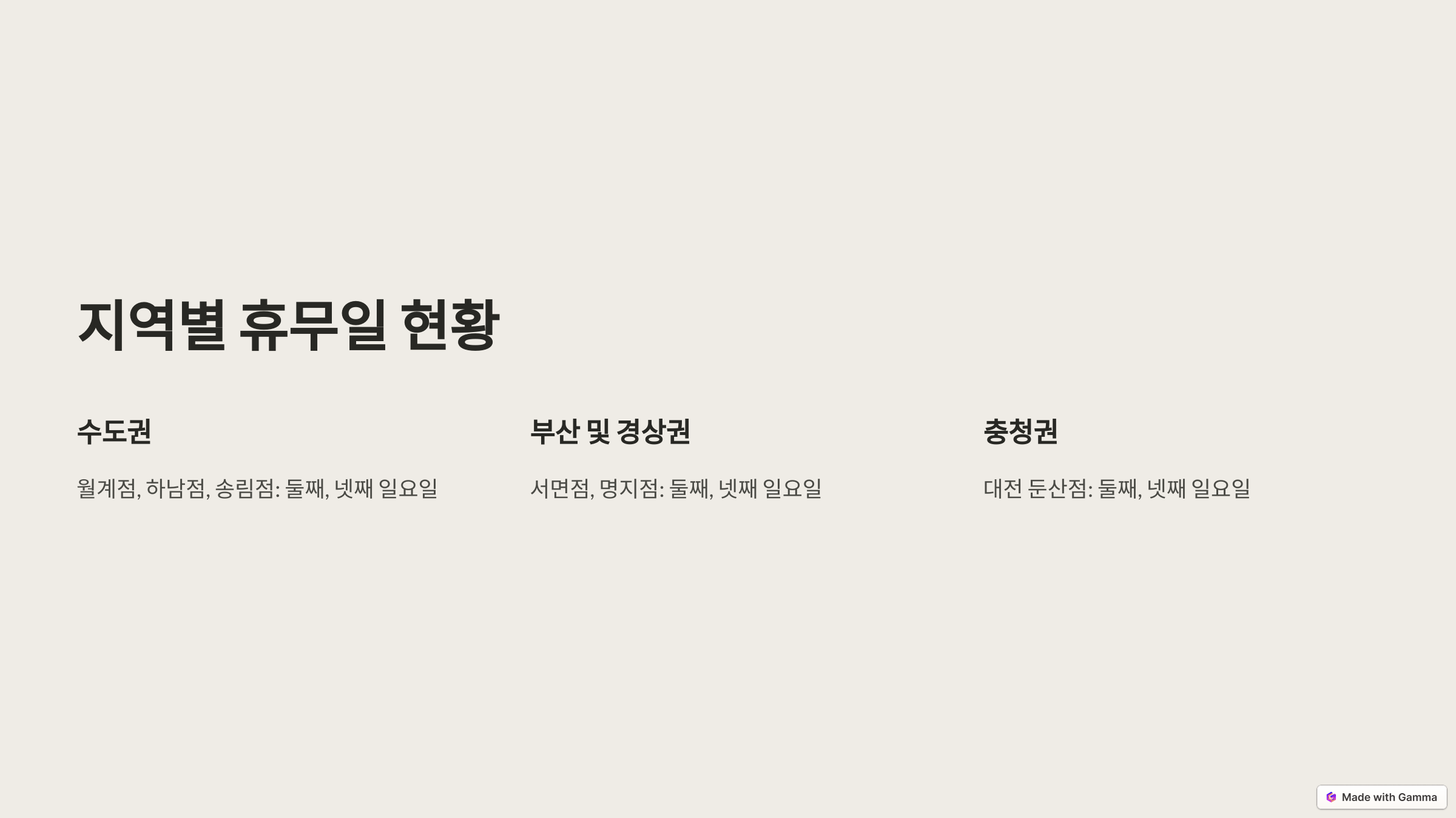 - 강릉점, 원주점: 둘째, 넷째 일요일