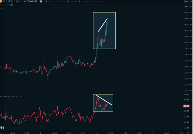 - 부정적 다이버전스: 주가는 상승하는데 RSI는 하락하는 형태로, 향후 주가 하락 가능성