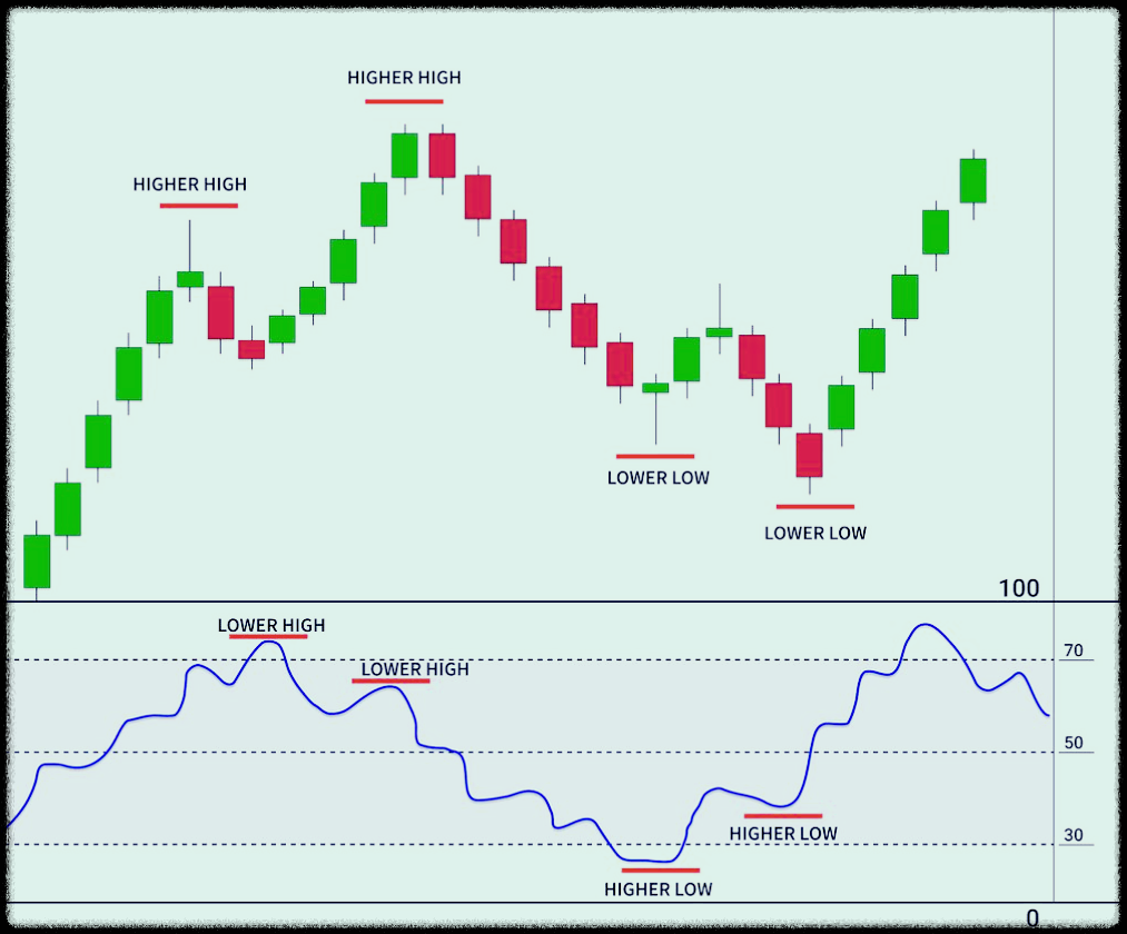 - 긍정적 다이버전스: 주가는 하락하는데 RSI는 상승하는 형태로, 향후 주가 반등 가능성